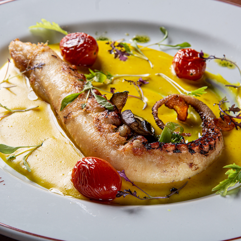 Polvo com aligot de batata enriquecido com queijo e açafrão
